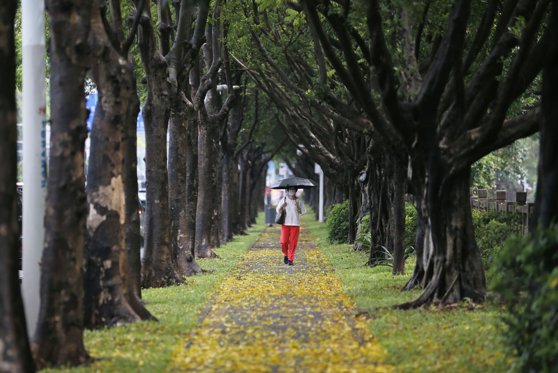 2020年5月26日中午13:46分,商報東二路附近,短時強降水加上刮風,路面上都是樹葉,一位市民經過。
