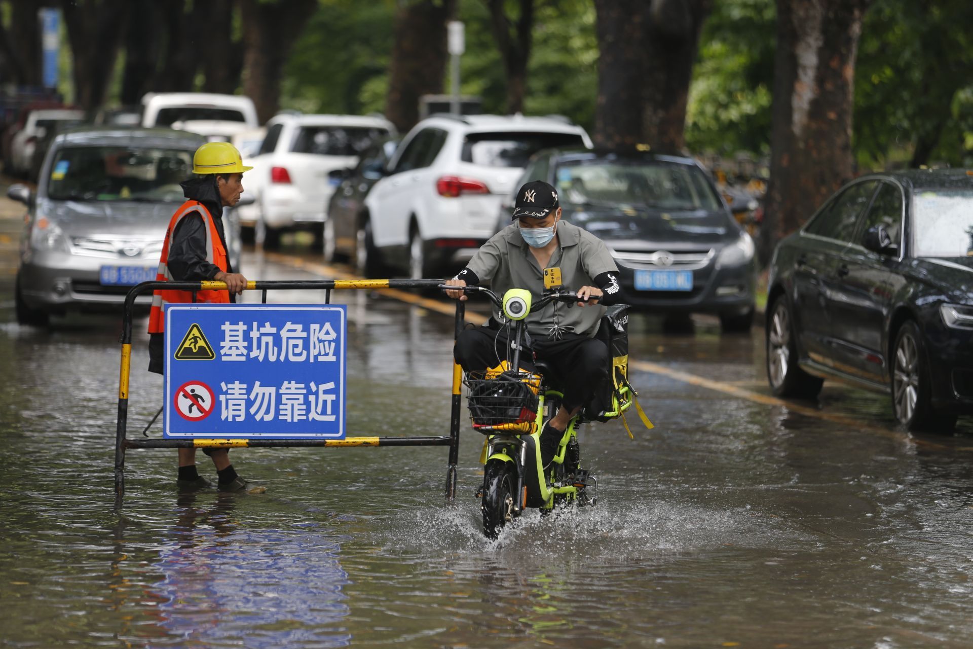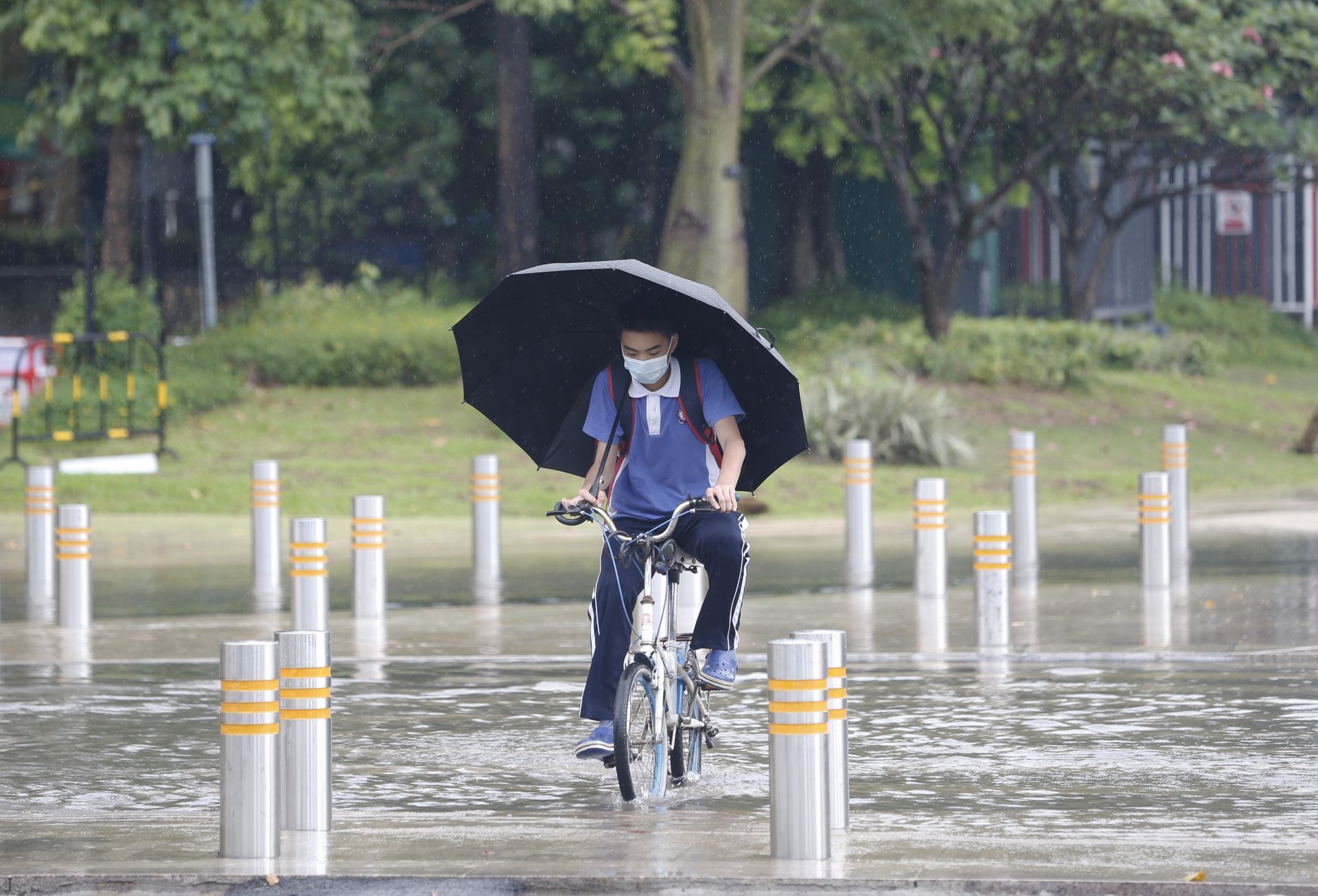 2020年5月26日中午13:46分,商報東二路,短時強降水導致路面水浸,一位騎士經過水浸路面。