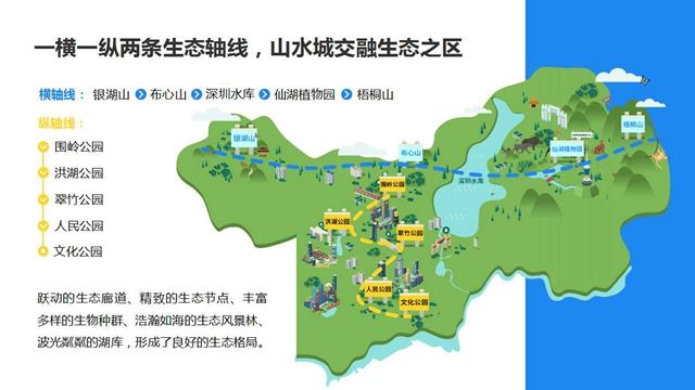 從橫軸線看羅湖,有銀湖山—布心山—深圳水庫—仙湖植物園—梧桐山;從縱軸線看羅湖,有圍嶺公園—洪湖公園—翠竹公園—人民公園—文化公園。躍動的生態(tài)廊道、精致的生態(tài)節(jié)點(diǎn)、豐富多樣的生物種群、浩瀚如海的生態(tài)風(fēng)景林、波光粼粼的湖庫,形成了良好的生態(tài)格局。