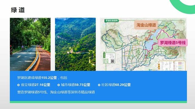 羅湖區(qū)建成綠道155.2公里,包括省立綠道、城市綠道、社區(qū)綠道等,塑造了羅湖綠道5號線、淘金山綠道等深圳市精品綠道。羅湖綠道5號線是融山水、休閑、生態(tài)和文化于一體的特色精品綠道,全線共分為山水休閑線、果林野趣線、河濱沁爽線三段,依山傍水而建,有效融合沿線自然景觀和人文景觀,把城市生活引入山水美景,使自然風(fēng)光更加貼近市民生活,形成“一路山水、一路文化”、獨(dú)具羅湖特色的風(fēng)景線。被市民譽(yù)為“深圳最美綠道”。