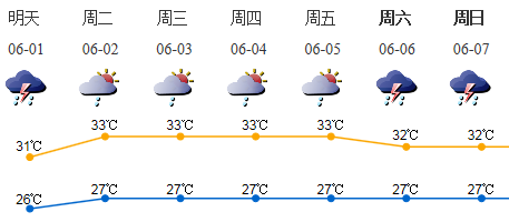 6月1日有雷陣雨,局部暴雨,季風降雨易出現(xiàn)在早晨到上午時段,氣溫26-31℃。