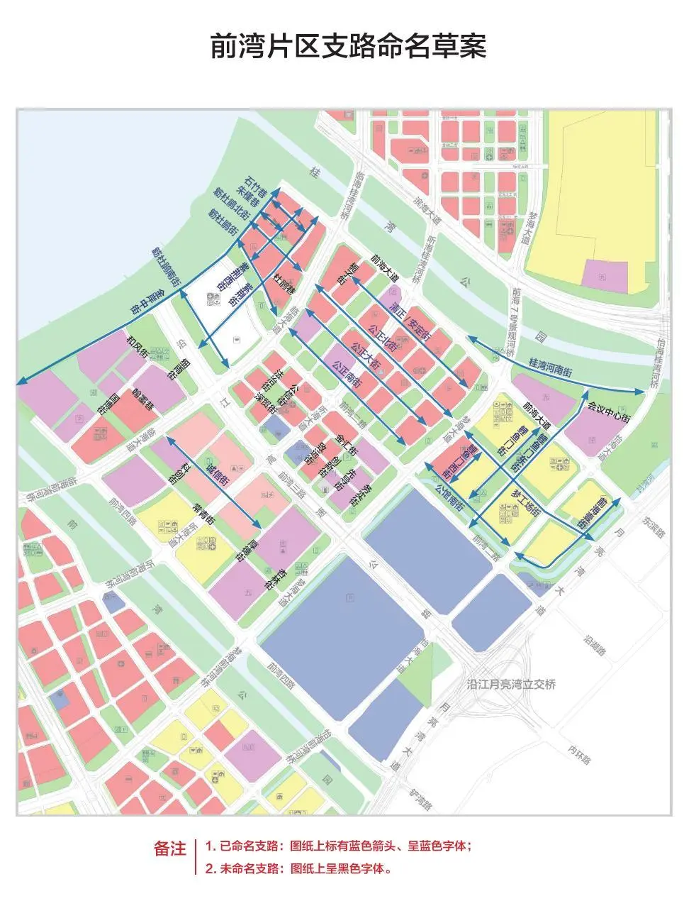 本次命名草案按照相關法規(guī)文件,結(jié)合前海桂灣、前灣、媽灣各片區(qū)的規(guī)劃定位、功能布局以及建設情況,針對三大片區(qū)和重要功能區(qū)功能、項目布局等特征,對前海15平方公里支路進行了全覆蓋命名。