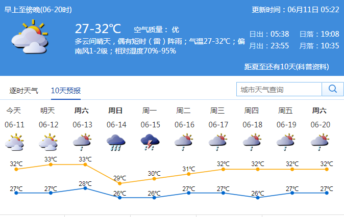 市氣象臺(tái)預(yù)測(cè),11-13日多云到晴天,偶有局地短時(shí)(雷)陣雨,天氣悶熱,11日氣溫27-32℃;展望14-15日有一次降雨過程。