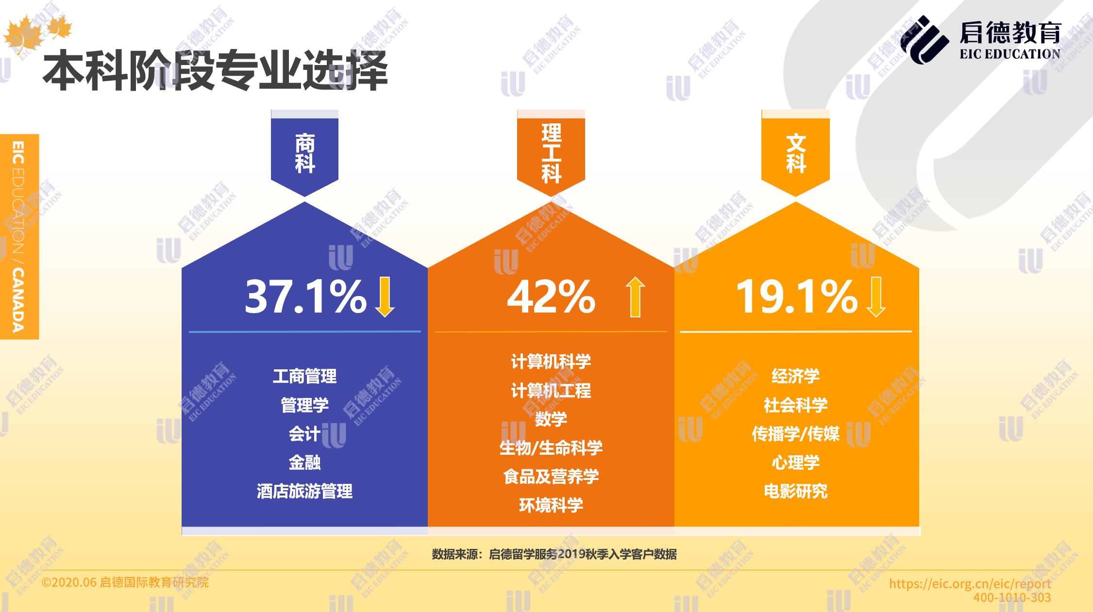啟德留學(xué)服務(wù)2019秋季入學(xué)客戶數(shù)據(jù)顯示,在本科階段專業(yè)選擇理工科占比42%,商科占比37.1 %,文科19.1%,理工科的申請(qǐng)人數(shù)超過(guò)了商科。碩士階段選擇最多的專業(yè)是 MBA、教育學(xué)和計(jì)算機(jī),其他新興的跨學(xué)科專業(yè)包括滑鐵盧大學(xué)的數(shù)字科學(xué)與人工智能碩士,滑鐵盧大學(xué)的 MBET (商業(yè)、創(chuàng)業(yè)和技術(shù)專業(yè)),與麥克馬斯特大學(xué)的 MEEI (工程、創(chuàng)業(yè)與創(chuàng)新專業(yè))。