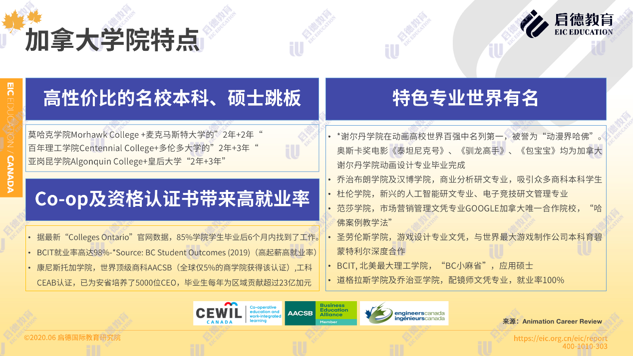 據(jù)最新“ Colleges Ontario”官網(wǎng)數(shù)據(jù),85 %的學(xué)院學(xué)生畢業(yè)后6個(gè)月內(nèi)找到了工作,91%的雇主對(duì)學(xué)生表示非常滿意。如康尼斯托加學(xué)院,擁有世界頂級(jí)商科 AACSB與工科 CEAB認(rèn)證,為安省培養(yǎng)了5000位 CEO,畢業(yè)生每年為區(qū)域貢獻(xiàn)超過(guò)23億加元。而奧斯卡獎(jiǎng)電影《泰坦尼克號(hào)》、《馴龍高手》、《包寶寶》均為加拿大謝爾丹學(xué)院動(dòng)畫設(shè)計(jì)專業(yè)畢業(yè)完成。北阿伯塔學(xué)院的納米技術(shù)專業(yè),杜倫學(xué)院的人工智能專業(yè),道格拉斯學(xué)院的配鏡師專業(yè),范莎學(xué)院的飛機(jī)維修專業(yè)也是世界有名的特色專業(yè)。