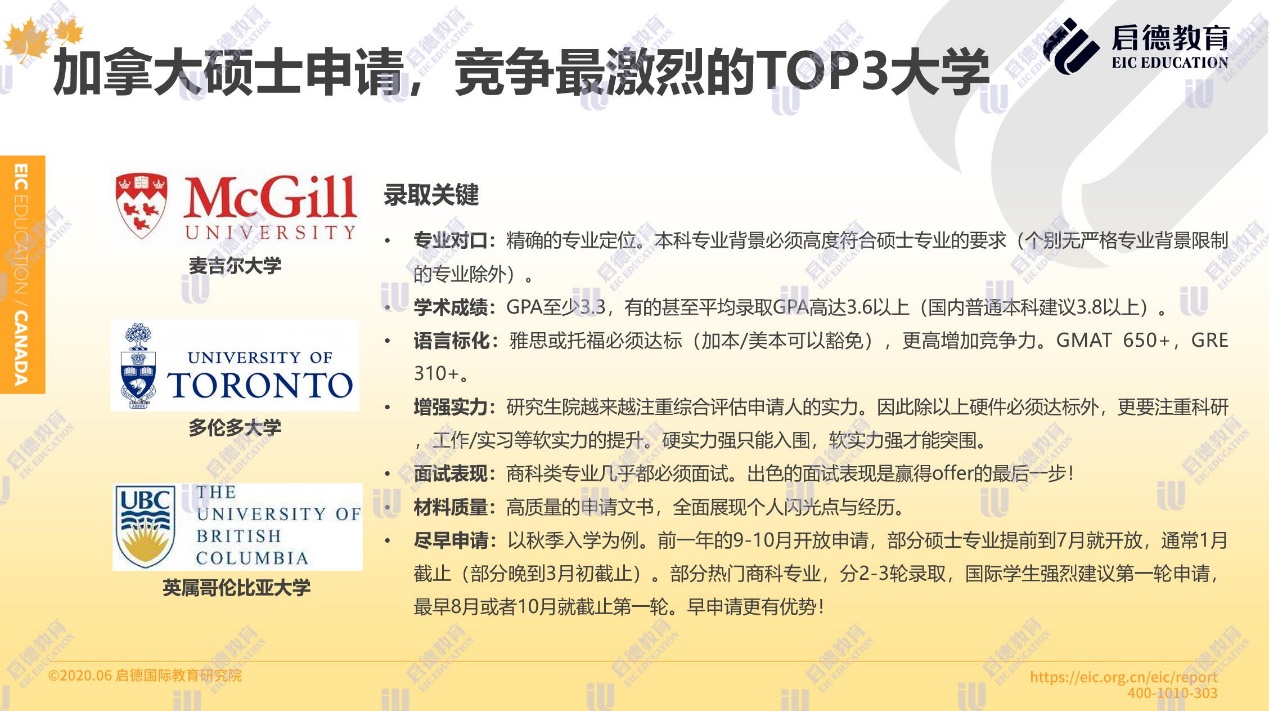 據(jù)啟德留學(xué)加拿大項(xiàng)目介紹,加拿大碩士申請(qǐng)競(jìng)爭(zhēng)最激烈的三所大學(xué)為麥吉爾大學(xué)、多倫多大學(xué)與英屬哥倫比亞大學(xué)。申請(qǐng)人 GPA至少達(dá)到3.3,有的甚至要求平均錄取 GPA高達(dá)3.6以上(國(guó)內(nèi)普通本科建議3.8以上);雅思或托福必須達(dá)標(biāo)(加本 /美本可以豁免), GMAT650+, GRE310+;除硬件必須達(dá)標(biāo)外,加拿大名校注重科研、工作 /實(shí)習(xí)等軟實(shí)力的提升;商科類專業(yè)幾乎都必須面試。