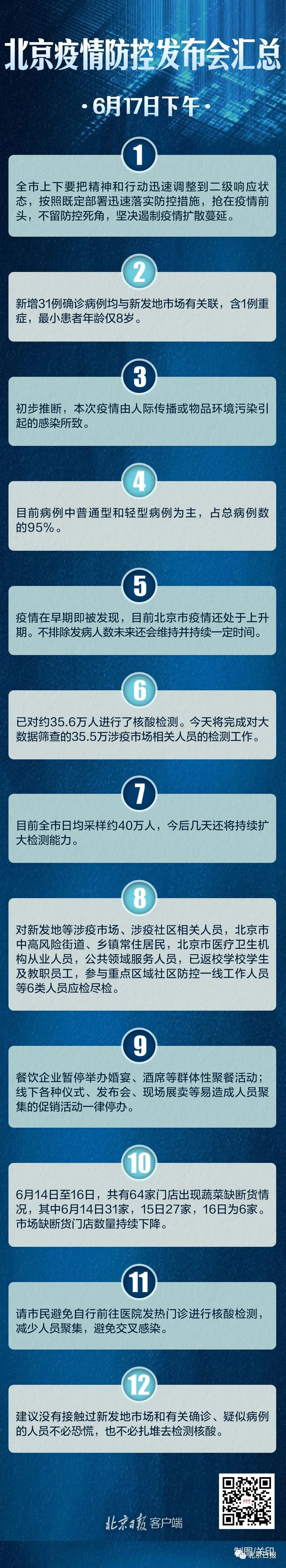 北京新冠肺炎疫情防控工作領(lǐng)導(dǎo)小組檢疫檢測(cè)工作組副組長(zhǎng)、市委組織部副部長(zhǎng)張強(qiáng)介紹,6月13日起,已迅速對(duì)新發(fā)地等出現(xiàn)疫情的市場(chǎng)人員、周邊小區(qū)居民、大數(shù)據(jù)排查涉疫市場(chǎng)人員,社區(qū)敲門行動(dòng)中主動(dòng)報(bào)告、有關(guān)接觸史的人員以及全市各農(nóng)貿(mào)市場(chǎng)工作人員約35.6萬人進(jìn)行了核酸檢測(cè)。6月17日將完成對(duì)大數(shù)據(jù)篩查的涉疫市場(chǎng)相關(guān)人員的檢測(cè)工作,對(duì)重點(diǎn)行業(yè)、重點(diǎn)領(lǐng)域、重點(diǎn)地區(qū)人員的核酸檢測(cè)工作也在同步進(jìn)行。