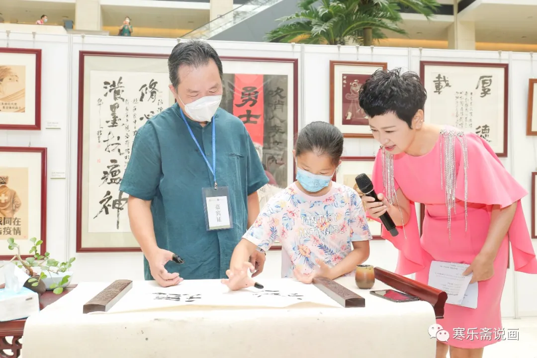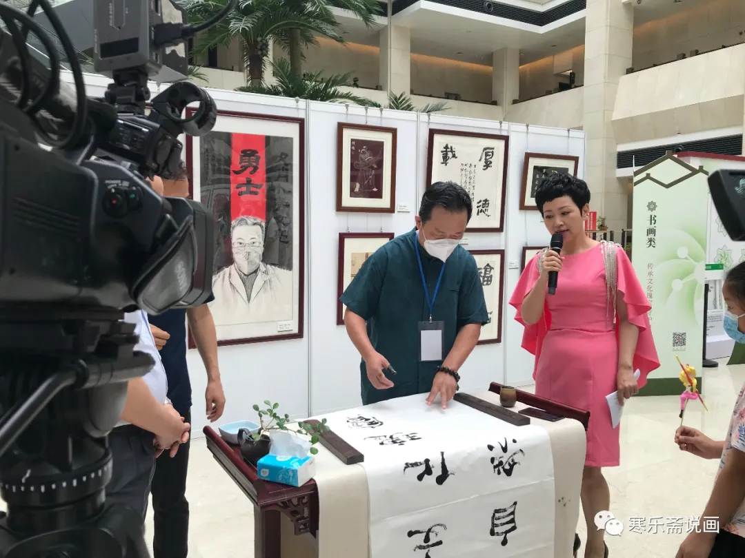 王和平在活動(dòng)現(xiàn)場(chǎng)揮指書寫“傳承文化瑰寶,守護(hù)自然之家”并接受主持人采訪。