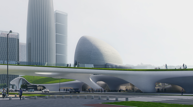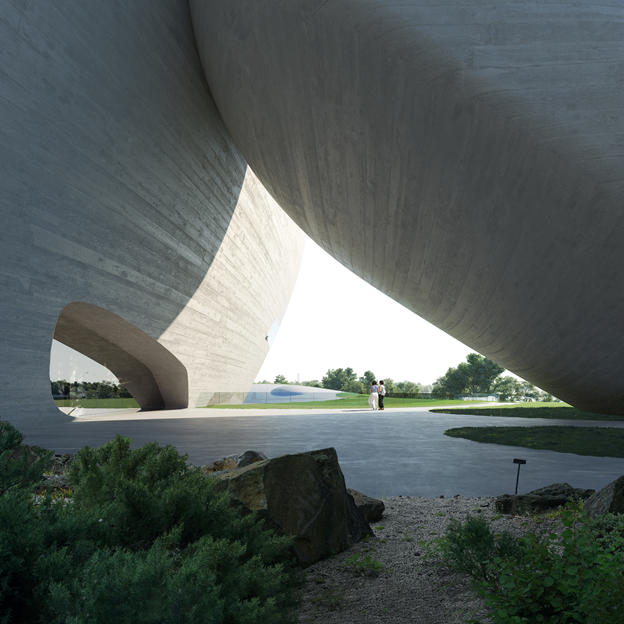 MAD的方案將較大體量的標(biāo)準(zhǔn)展覽空間、公共教育場(chǎng)地、圖書(shū)館、接待大堂、咖啡廳、配套商業(yè)等功能放置在首層并覆土,屋頂形成綠地與城市直接連接,構(gòu)成這個(gè)區(qū)域面積最大的公園。順應(yīng)建筑的曲線,屋頂坡度自然發(fā)展,柔和回落大地,接壤之處設(shè)計(jì)成數(shù)個(gè)下沉庭院,高低相合,延綿不斷。