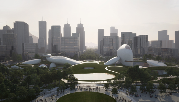 屋面覆土廣場(chǎng)、地景建筑以及地下公共展覽空間是主體
