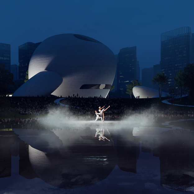 廣場中央的水池,可以作為劇場,容納萬人活動;景觀中預留出多處平臺,提供公共藝術(shù)展覽、市集、藝術(shù)節(jié)、音樂節(jié)等戶外活動場地;公園將城市的中軸線延續(xù)到海邊,行人步道、自行車道蜿蜒穿梭在建筑和草坪之間,為市民提供海濱休閑場地。