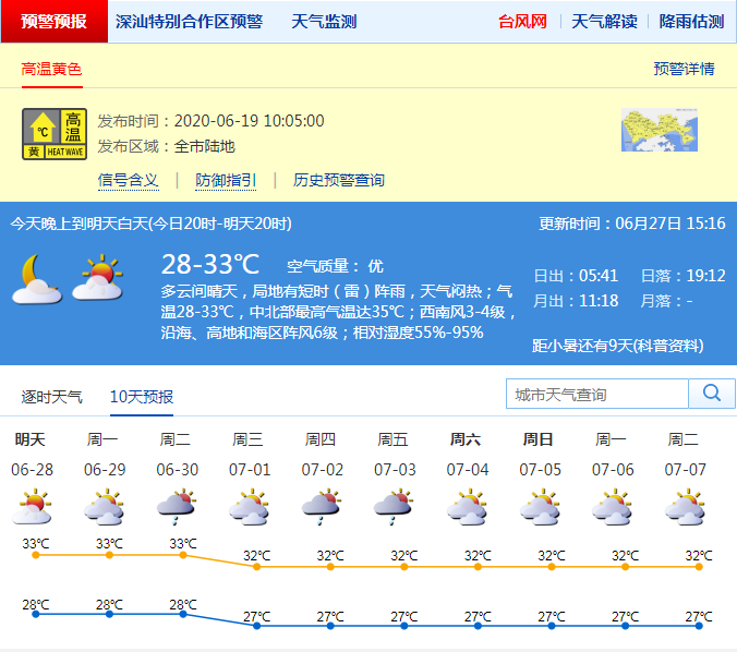 根據(jù)深圳氣象局最新消息,深圳市27日17-20時(shí),多云間晴天,局地有零星小雨;氣溫29-32℃;西南風(fēng)3-4級(jí),沿海和高地最大陣風(fēng)6級(jí);相對(duì)濕度65%-85%。