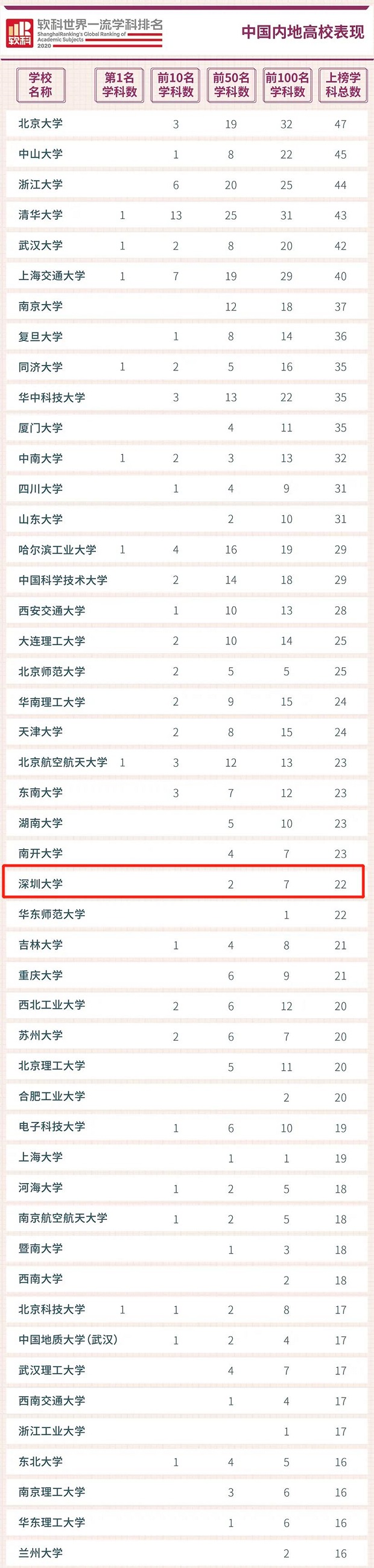 見(jiàn)圳客戶端·深圳新聞網(wǎng)2020年6月29日訊(見(jiàn)圳客戶端、深圳新聞網(wǎng)記者 梁榆其 金洪竹)6月29日,軟科正式發(fā)布2020“軟科世界一流學(xué)科排名”,排名覆蓋54個(gè)學(xué)科,涉及理學(xué)、工學(xué)、生命科學(xué)、醫(yī)學(xué)和社會(huì)科學(xué)五大領(lǐng)域,中國(guó)內(nèi)地共有253所高校上榜。深圳大學(xué)(以下簡(jiǎn)稱“深大”)共有22個(gè)學(xué)科上榜,上榜學(xué)科數(shù)領(lǐng)跑地方高校,總上榜學(xué)科數(shù)位列中國(guó)內(nèi)地高校26位,其中,7個(gè)學(xué)科位列世界百?gòu)?qiáng),2個(gè)學(xué)科進(jìn)入世界50強(qiáng)。
