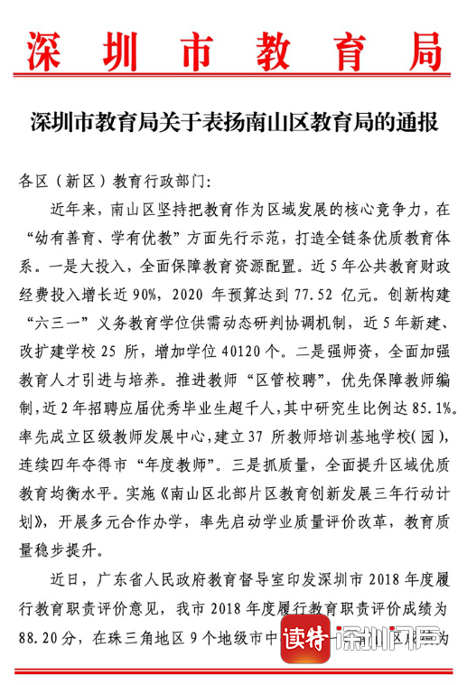 見圳客戶端·深圳新聞網(wǎng)2020年7月1日訊(深圳特區(qū)報記者 李麗)6月30日,《深圳市教育局關(guān)于表揚(yáng)南山區(qū)教育局的通報》在全市教育界引起關(guān)注。通報表示,近日,廣東省人民政府教育督導(dǎo)室印發(fā)深圳市2018年度履行教育職責(zé)評價意見,深圳2018年度履行教育職責(zé)評價成績?yōu)?8.20分,在珠三角地區(qū)9個地級市中排名第一,其中,南山區(qū)成績?yōu)?8.64分,在珠三角地區(qū)48個縣(市、區(qū))中排名第一。經(jīng)研究,決定在全市教育系統(tǒng)對南山區(qū)教育局給予通報表揚(yáng),并希望南山區(qū)教育局率先建成全國義務(wù)教育優(yōu)質(zhì)均衡發(fā)展區(qū)。