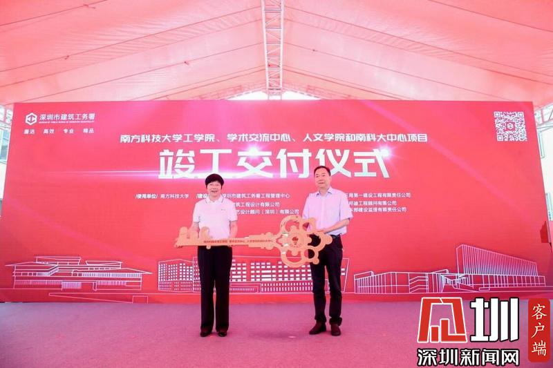 深圳市建筑工務署署長喬恒利向南方科技大學黨委書記郭雨蓉移交鑰匙牌。