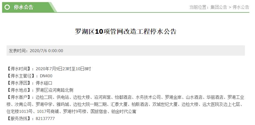 2020年7月9日23時(shí)至10日8時(shí),羅湖區(qū)邊檢二院、羅湖金岸小區(qū)、邊檢大院一期二期、羅湖村9號(hào)樓、鉑金時(shí)代公寓等小區(qū)將停水9小時(shí)。