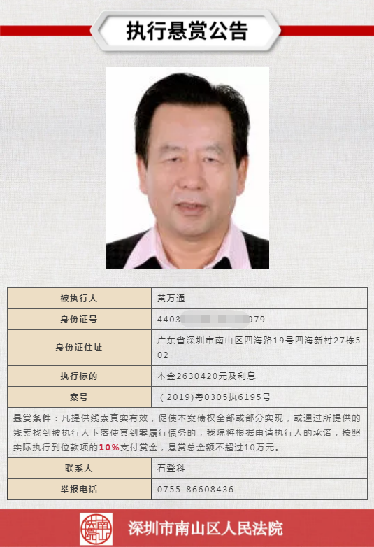 經(jīng)申請執(zhí)行人申請,深圳市南山區(qū)人民法院向社會發(fā)布懸賞舉報(bào)公告,凡提供線索真實(shí)有效,促使本案債權(quán)全部或部分實(shí)現(xiàn),或通過所提供的線索找到被執(zhí)行人下落使其到案履行債務(wù)的,深圳市南山區(qū)人民法院將根據(jù)申請執(zhí)行人的承諾,按照實(shí)際執(zhí)行到位款項(xiàng)給予一定金額的賞金。