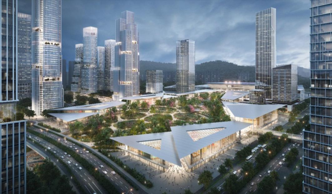 聚落肌理的創(chuàng)新交流坊環(huán)抱中央綠芯,設置公共服務、餐飲食肆等功能,通過通透的首層設計、大挑檐連廊打造,使人們在安享城市服務的同時,也能夠欣賞優(yōu)質(zhì)的自然生態(tài)景觀,形成一個融合生態(tài)、交通和公共生活的超級中樞。