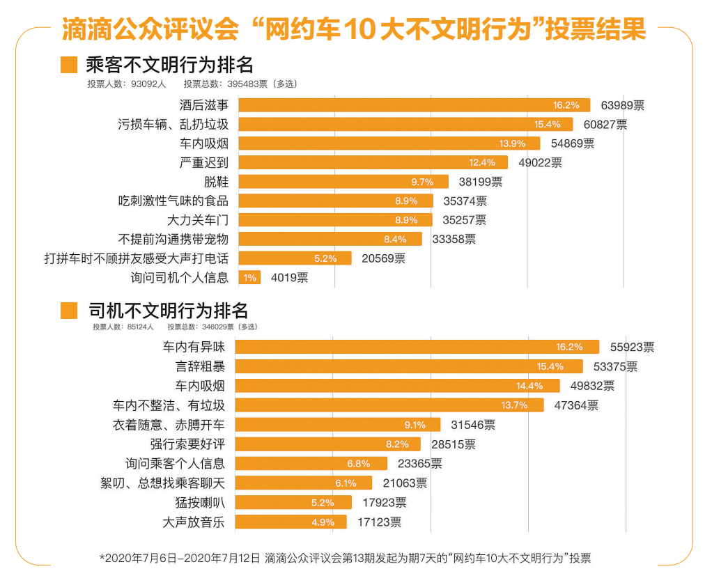 為進(jìn)一步優(yōu)化平臺(tái)規(guī)則和治理方向,滴滴公眾評(píng)議會(huì)第13期發(fā)起為期7天(7月6日至7月12日)的“網(wǎng)約車10大不文明行為”公眾投票和意見征集。本次活動(dòng)累計(jì)178216人次投票,收到4533條用戶留言,用戶分享了打車中遇到的遭遇,并積極獻(xiàn)言獻(xiàn)策。其中,共93092人次參與乘客不文明行為投票,共投出395483票,乘客酒后滋事以63989票高居“網(wǎng)約車10大不文明行為”榜首,污損車輛、亂扔垃圾獲得60827票,車內(nèi)吸煙54869票,排名第三。