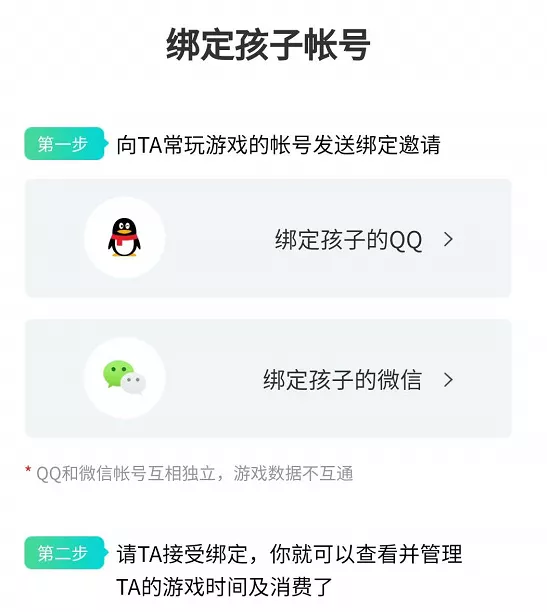 進(jìn)入系統(tǒng)后,可以選擇你是家長(zhǎng)還是孩子,比如選擇家長(zhǎng)后,可以選擇孩子是用你的賬號(hào)玩還是他自己的賬號(hào),如果是他自己的賬號(hào),就可以向他常玩的賬號(hào)發(fā)送綁定申請(qǐng),這里同時(shí)支持微信和QQ。