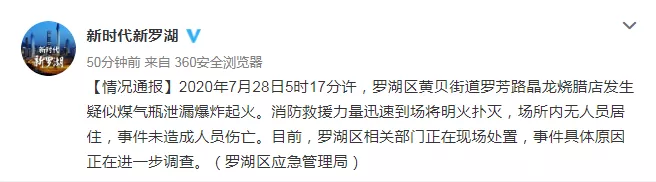 【情況通報(bào)】2020年7月28日5時17分許,羅湖區(qū)黃貝街道羅芳路晶龍燒臘店發(fā)生疑似煤氣瓶泄漏爆炸起火。消防救援力量迅速到場將明火撲滅,場所內(nèi)無人員居住,事件未造成人員傷亡。目前,羅湖區(qū)相關(guān)部門正在現(xiàn)場處置,事件具體原因正在進(jìn)一步調(diào)查。(羅湖區(qū)應(yīng)急管理局)