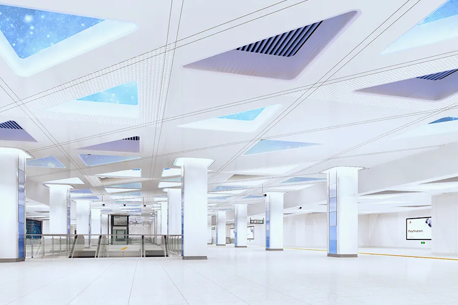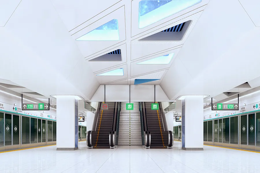 科學館站位于上步路與深南大道交叉口至濱河大道段,呈南北向布置。與1號線通道換乘,車站為地下三層單柱雙跨鋼筋混凝土框架結(jié)構(gòu),共設(shè)出入口6個:E、F,物業(yè)口1、2、3、4。此外,與1號線換乘通道。