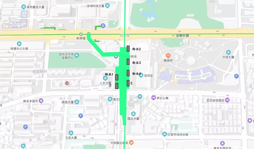 其中,E口位于上步路東側(cè)并朝向南園路;物業(yè)1口位于物業(yè)層,靠近上步大廈;物業(yè)2口、物業(yè)3口位于物業(yè)層,靠近平安銀行;F口位于上步路西側(cè)并朝向南園路;物業(yè)4口位于物業(yè)層,靠近佳兆業(yè)大廈。