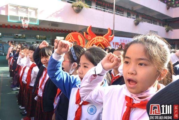 湖貝小學(xué)全體學(xué)生高昂宣誓,宣告新春奮發(fā)向上的心愿。