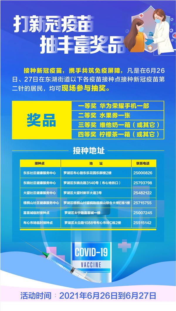 目前,東湖街道共設(shè)有6個(gè)疫苗接種點(diǎn):東樂社康中心、東曉社康中心、大望社康中心、梧桐山社康中心、喜薈城臨時(shí)接種點(diǎn)、布心市場臨時(shí)接種點(diǎn),6月26日至27日每天8時(shí)至22時(shí)間可接種。各位市民朋友們不要猶豫!不要遲疑!趕緊攜親朋好友到東湖街道接種點(diǎn)接種新冠疫苗領(lǐng)取豪華大獎(jiǎng)吧!