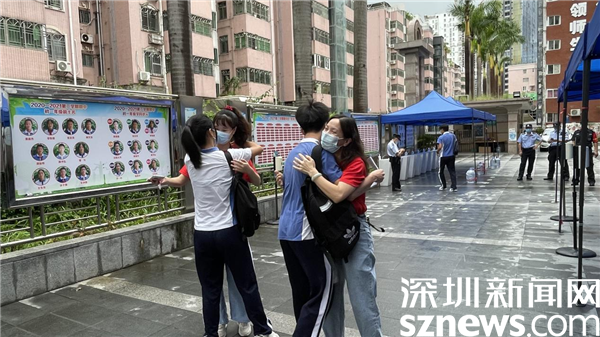 老師在考場(chǎng)入口為考生送上暖心擁抱,希望大家都能超常發(fā)揮,考出好成績(jī)。