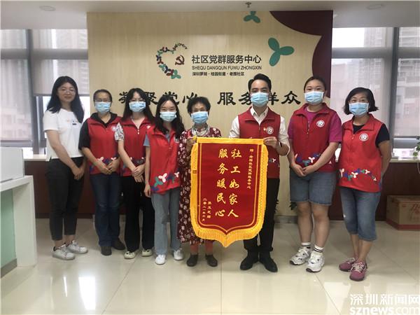 6月28日上午,79歲的社區(qū)居民張玉芝冒雨來到羅湖區(qū)桂園街道老圍社區(qū)黨群服務(wù)中心,將一面金光閃閃的錦旗,交到老圍社區(qū)黨委副書記黃小龍的手中。
