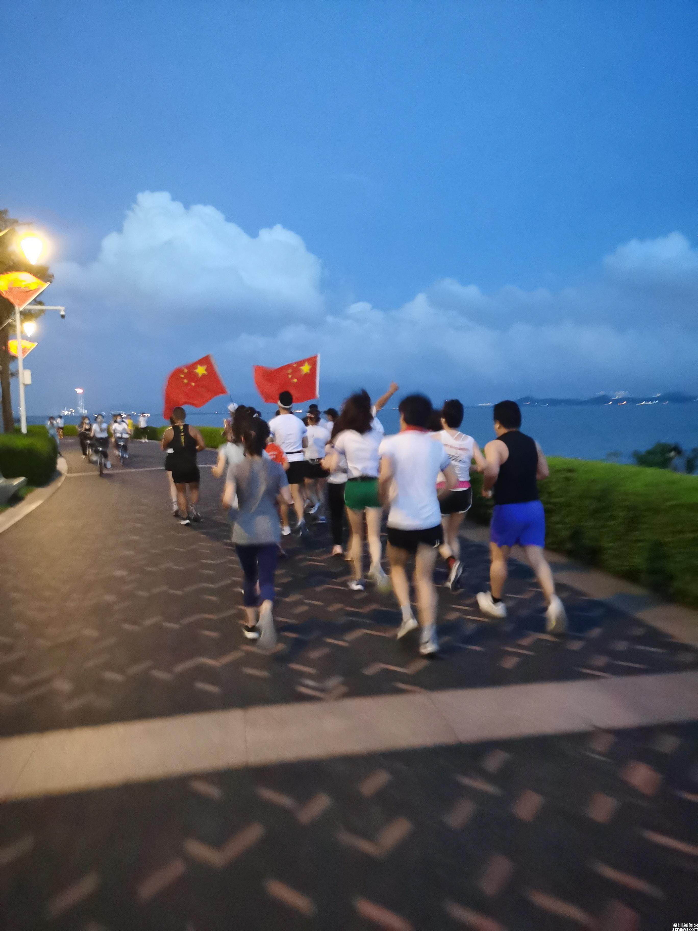 當天晚上,楊雨晨又來到深圳灣公園,與精彩人生跑團的跑友一起,打著五星紅旗,列隊奔跑。大家都是穿著團服自發(fā)而來,由衷地為自己的百年大黨驕傲。也有不少人跟楊雨晨一樣,早上跑完了,意猶未盡,晚上再跑。楊雨晨說:“看了中國共產(chǎn)黨成立100周年大會,心里特別振奮,特別給力,所以,早上跑完,晚上再跟大家一起慶祝。”