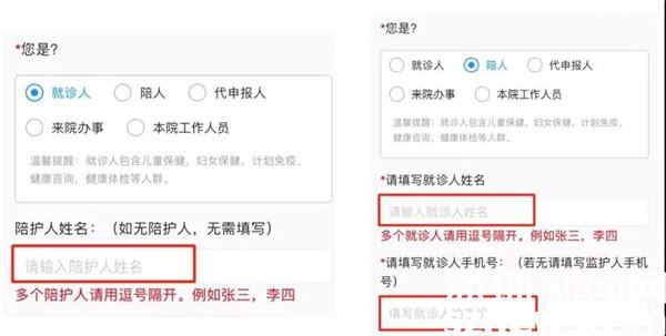 1、填寫本人信息后選擇身份,按照要求填寫陪護人或就診人信息。