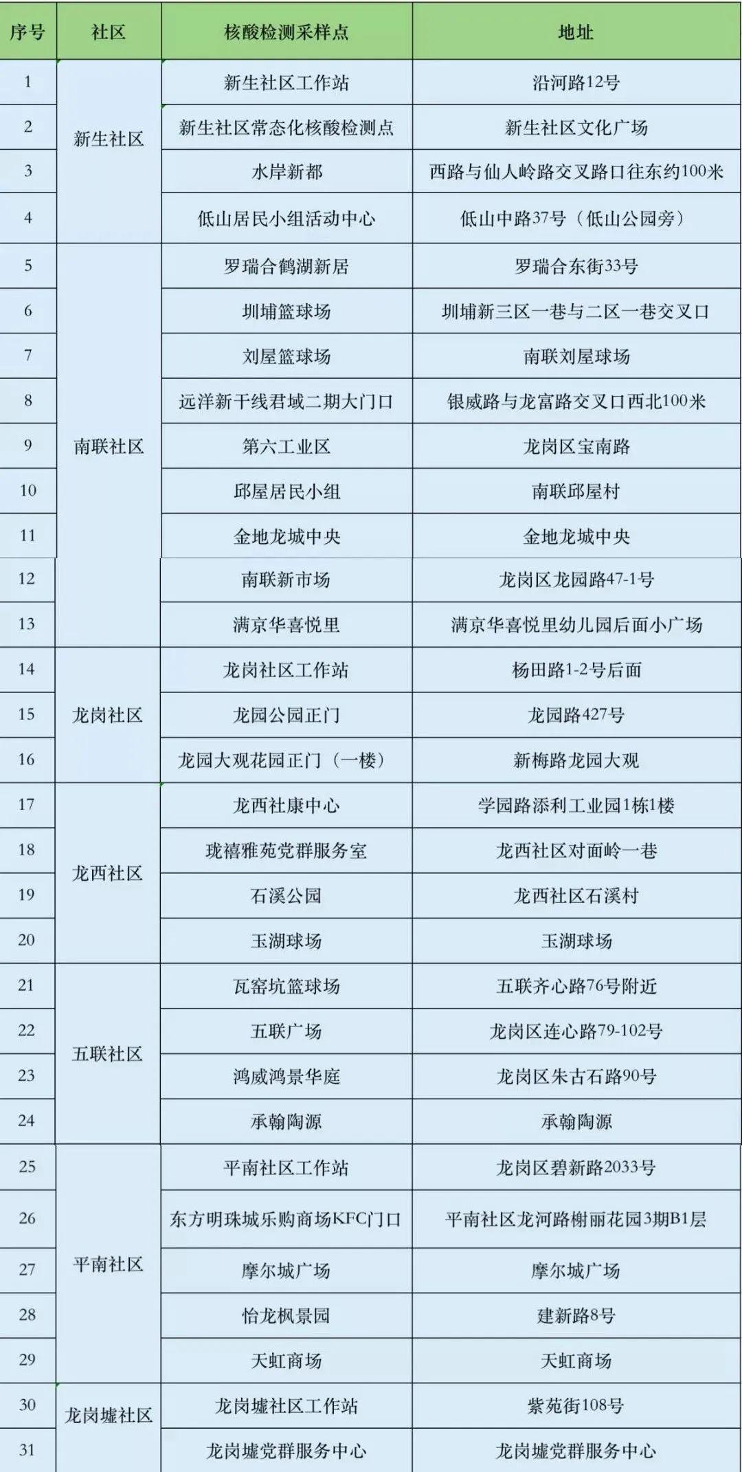 根據(jù)疫情防控需要,為最大程度保障人民群眾生命安全和身體健康,龍崗區(qū)各街道于1月10日開(kāi)展新一輪免費(fèi)核酸檢測(cè)以下點(diǎn)位統(tǒng)計(jì)截至1月10日。各點(diǎn)位動(dòng)態(tài)更新請(qǐng)以社區(qū)通知及現(xiàn)場(chǎng)實(shí)際情況為準(zhǔn)。