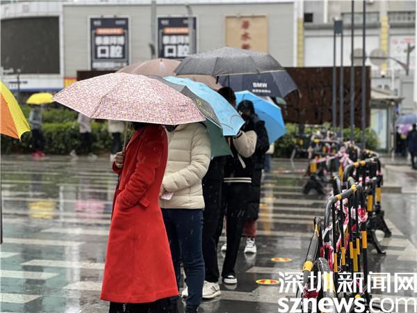 地上是淅瀝瀝的小雨,天氣惡劣,前來開展核酸檢測的市民依然遵守“一米距離”等防疫要求,現(xiàn)場井然有序。