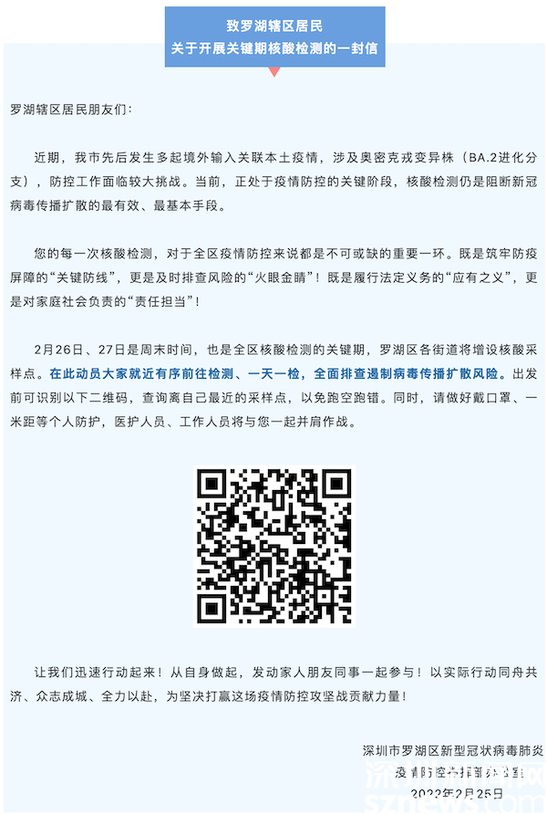讀特客戶端·深圳新聞網(wǎng)2022年2月26日訊(記者 覃鈺清)2月25日晚,羅湖區(qū)新型冠狀病毒肺炎疫情防控指揮部辦公室發(fā)出《致羅湖轄區(qū)居民關(guān)于開展關(guān)鍵期核酸檢測的一封信》,該信函指出,本周末(2月26日、27日)是全區(qū)核酸檢測的關(guān)鍵期,全區(qū)各街道共設(shè)置200個核酸采樣點(diǎn),動員轄區(qū)所有居民就近有序前往檢測、一天一檢,全面排查遏制病毒傳播擴(kuò)散風(fēng)險(xiǎn)。26日上午,記者前往羅湖區(qū)桂園街道實(shí)地探訪核酸檢測開展情況。