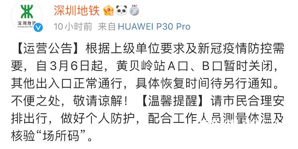 上午8時,深圳地鐵發(fā)布運(yùn)營公告:3月6日起,黃貝嶺站A口、B口暫時關(guān)閉,其他出入口正常通行。