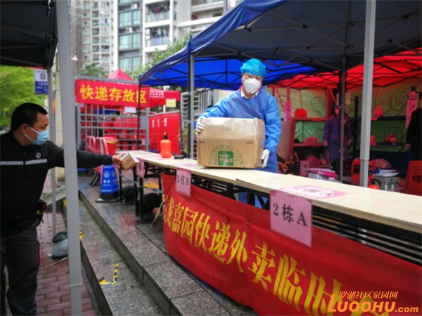 小區(qū)自建的快遞外賣臨時存放點,是由物業(yè)與居民志愿者共同管理的,分揀員主要由物業(yè)人員和業(yè)主志愿者組成。分揀員穿上防護服與快遞、外賣小哥在郵寄快遞消毒交接區(qū)進行交接,避免了所有人員與快遞、外賣小哥直接接觸,保持了有效的安全間隔。在臨時存放點可以看到由志愿者擔當著分揀員,他們有條不紊、熟練地將快遞對應放于相應樓棟的貨架上。