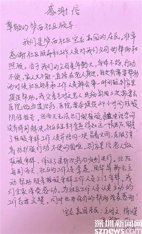 近日,羅湖區(qū)筍崗街道筍西社區(qū)寶龍嘉園住戶毛時文的老伴陳漢英阿姨來到筍西社區(qū)工作站,送上了一封手寫的感謝信,感謝社區(qū)提供貼心的上門核酸采樣服務。