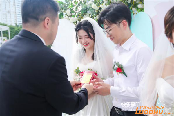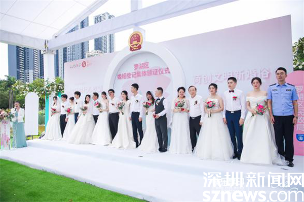 羅湖區(qū)委常委、宣傳部部長呂漫妮,羅湖區(qū)民政局局長楊文秀,羅湖區(qū)民政局副局長藍(lán)茜,2021年深圳市“最美家庭”的獲得者李道倫和王蓬勃夫婦,羅湖公益“紅娘”汪朝暉作為特邀頒證師,分別給9對新人頒證。