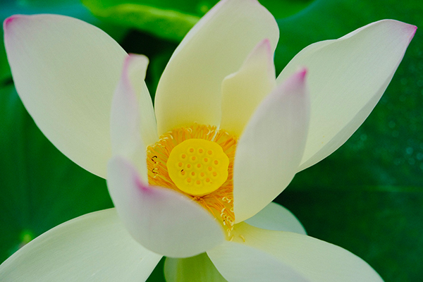 綻放的荷花,粉白的花瓣一瓣一瓣向外舒展,花蕊仰著嫩黃的小臉,含笑地向你看來。