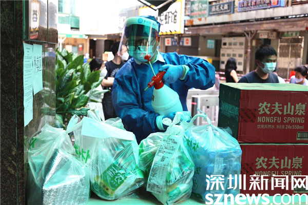 8月29日下午,深圳新聞網(wǎng)記者來(lái)到羅湖區(qū)南湖街道文錦社區(qū)凱悅?cè)A庭,只見(jiàn)小區(qū)居民正保持著一米距離有序地進(jìn)行核酸檢測(cè),身穿防護(hù)服的“藍(lán)墩墩”在一旁忙碌著。記者在現(xiàn)場(chǎng)看到偶有“騎士”將居民在網(wǎng)上商城所下單的物資像傳送接力棒一樣交到“藍(lán)墩墩”的手上,“藍(lán)墩墩”接過(guò)之后,立即進(jìn)行全方位的消殺工作。