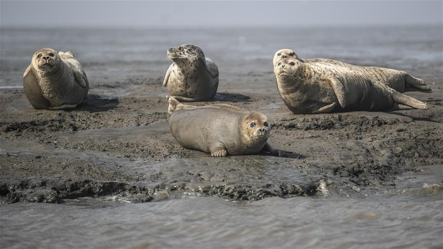 3月25日,一群斑海豹在遼寧盤錦雙臺(tái)河口三道溝海域的灘涂上休息。新華社記者潘昱龍攝