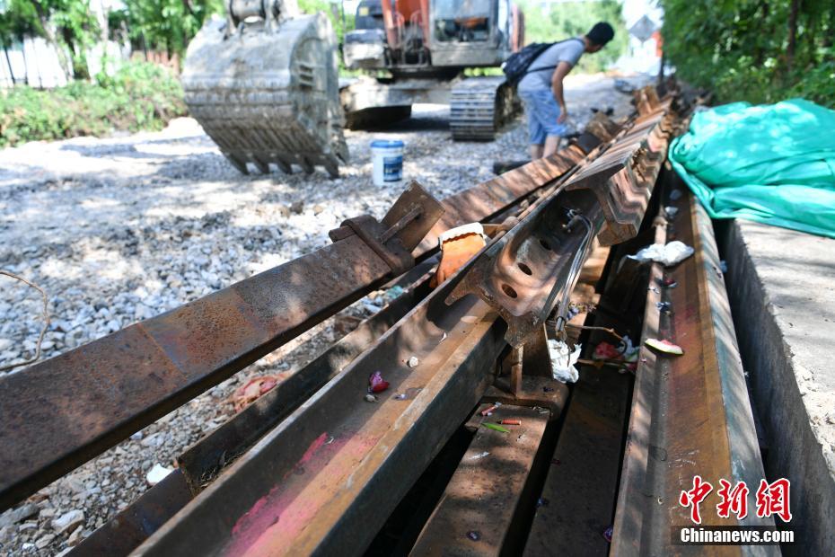 5月8日,滇越鐵路的鐵軌被拆除后堆放在工地旁。當日,昆明地鐵4、5號線正在進行建設,由于施工影響,穿城而過的一段百年滇越鐵路被拆除,“老鐵路”為“新地鐵”建設讓步。據(jù)了解,在地鐵建設完工后,這段滇越鐵路將被重新鋪設,恢復運營。中新社記者 任東 攝