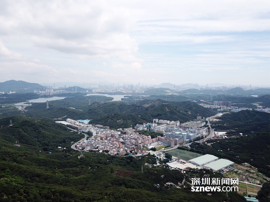 從羊臺山風門凹山腰看西麗水庫及山腳下麻磡村