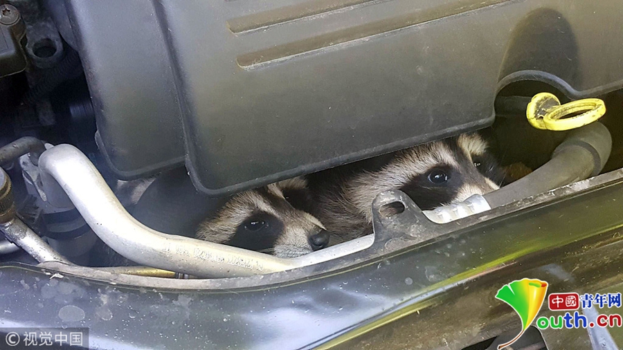 年紀(jì)太小不懂事 六只小浣熊汽車引擎里安“家”