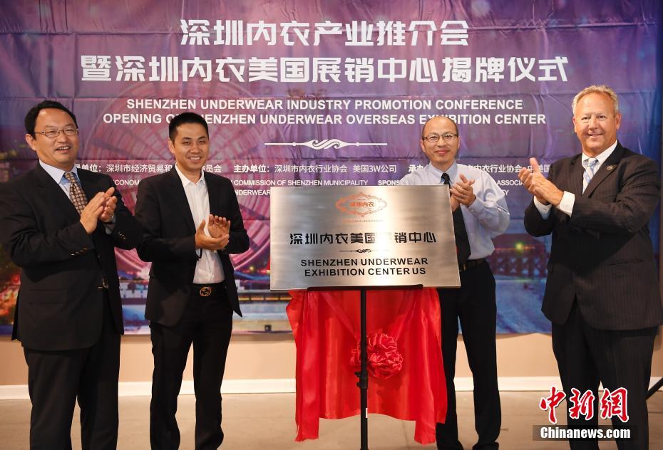 當?shù)貢r間7月17日,深圳市內(nèi)衣行業(yè)協(xié)會在中美國際(美東)創(chuàng)業(yè)港——默特爾比奇市Waccoma Center舉行深圳內(nèi)衣產(chǎn)業(yè)推介會暨深圳內(nèi)衣美國展銷中心揭牌儀式。中美國際(美東)創(chuàng)業(yè)港聯(lián)合深圳市內(nèi)衣行業(yè)協(xié)會為深圳內(nèi)衣品牌進駐美東市場搭建綠色通道和產(chǎn)業(yè)孵化平臺,采用“時尚秀+靜態(tài)展”的形式,促進中美內(nèi)衣文化和時尚的交流。圖為霍里郡議會主席馬克先生Mark Lazrus(右一)、深圳市經(jīng)濟貿(mào)易和信息化委員會副主任高林(左一)、美國3W公司董事長王為工(右二)、深圳市內(nèi)衣行業(yè)協(xié)會常務副會長兼秘書長張峰偉(左二)出席揭牌儀式。中新社記者 陳文 攝