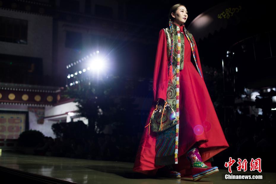 8月12日晚,由西藏職業(yè)技術(shù)學(xué)院與北京服裝學(xué)院共同打造的“凈美雪頓·美好生活”西藏民族服裝與服飾展演活動在拉薩舉行?,F(xiàn)場通過傳統(tǒng)篇、現(xiàn)代篇與未來篇三個篇章,展演了藏族傳統(tǒng)服裝26套,設(shè)計創(chuàng)新服裝58套,共計84套服裝。圖為模特展示現(xiàn)代設(shè)計的創(chuàng)新藏族服飾。中新社記者何蓬磊 攝
