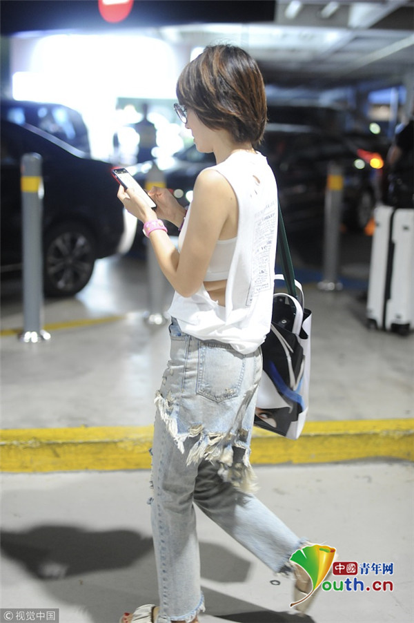 2018年8月20日,上海,馬伊琍現(xiàn)身機場,她身穿清爽白T,小蠻腰隱現(xiàn),搭配“乞丐風(fēng)”破洞褲扮潮,一路低頭走狂刷手機。
