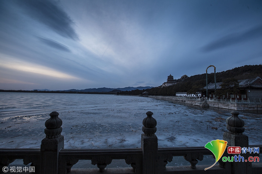 2018年2月23日,北京頤和園。當(dāng)天日落時(shí)分昆明湖上空出現(xiàn)夕陽(yáng)余暉的美景,夢(mèng)幻般的色彩將古老的皇家園林裝扮得美輪美奐,讓人流連忘返。